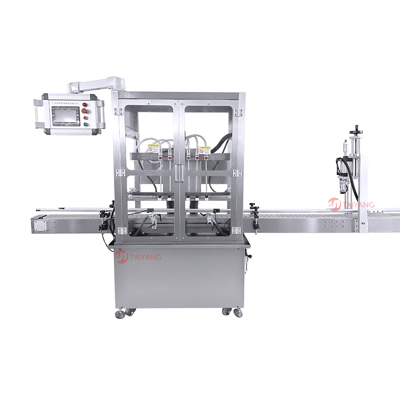 Denna Taiyang sex-huvudvätskefyllning och täckmaskin används ofta i olika typer av produktfyllning, såsom kosmetika, livsmedelsindustri, högt skummande vattenlösningsmedel och andra produkter fyllning.